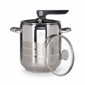 Mecanismul ferm de inchidera va asigura un gatit fara griji, reducand totodata timpul de pregatire a mancarurilor si oferind o economisire de energie. Pastreaza valorile nutritive si minerale din alimente. Manerele sunt nituite si parte integranta din produs.. Indiferent daca esti sau nu un bucatar profesionist, oala sub presiune, te va ajuta sa pregatesti mancaruri extraodinare, fara prea mult efort. Incalzeste rapid si mentine eficient temperatura datorita, datorita bazei in 3 straturi, scade considerabil timpul de fierbere. Capacul dispune de doua supape, una fiind pentru siguranta.